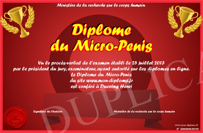 Envoyez par email votre Diplôme du Micro-Penis personalisé