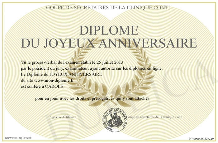 Envoyez par email votre Diplôme du JOYEUX ANNIVERSAIRE personalisé