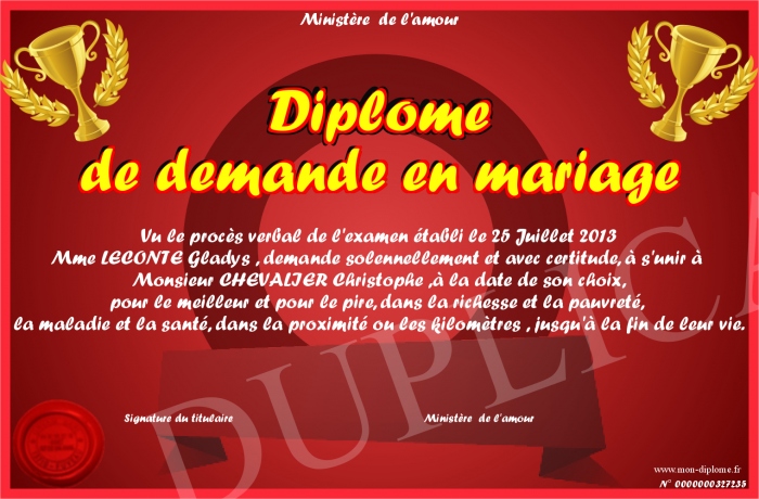 Envoyez par email votre Diplome de demande en mariage personalisé