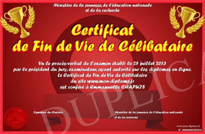 Envoyez par email votre Certificat de Fin de Vie de Célibataire personalisé