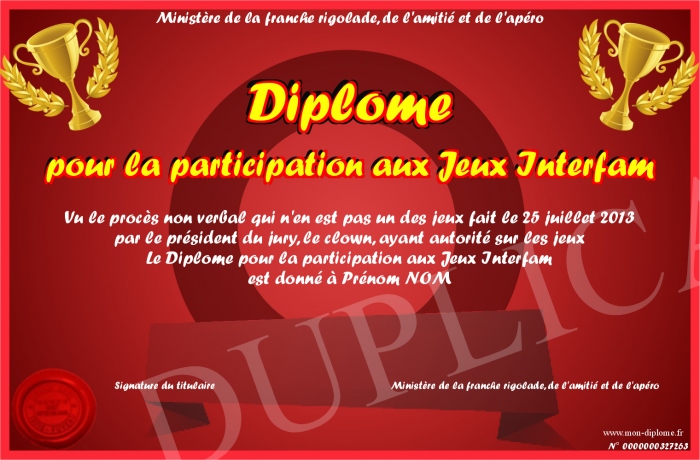 Envoyez par email votre Diplôme pour la participation aux Jeux Interfam personalisé