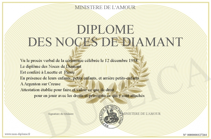 Envoyez par email votre DIPLOME DES NOCES DE DIAMANT personalisé
