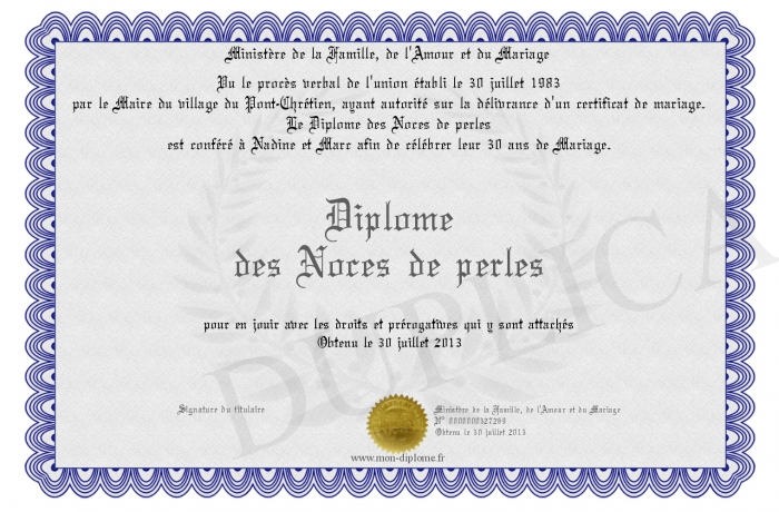 Envoyez par email votre Diplôme des Noces de perles personalisé