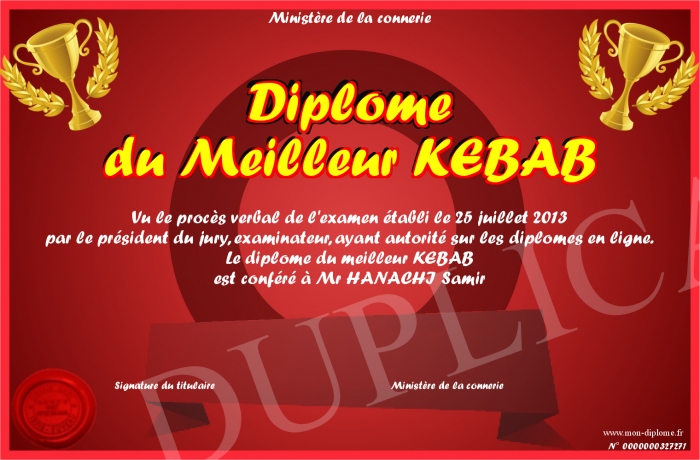 Envoyez par email votre Diplôme du Meilleur KEBAB personalisé