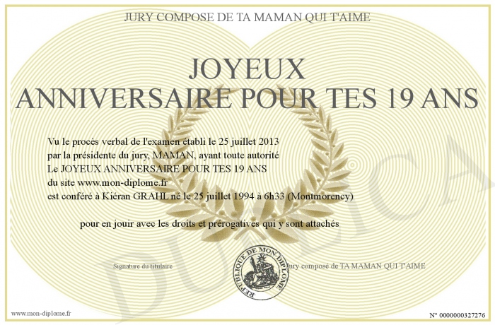 Envoyez par email votre JOYEUX ANNIVERSAIRE POUR TES 19 ANS personalisé
