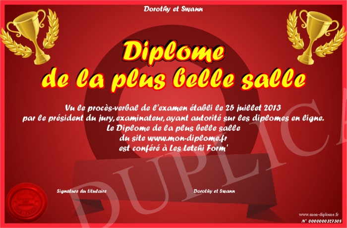 Envoyez par email votre Diplôme de la plus belle salle personalisé