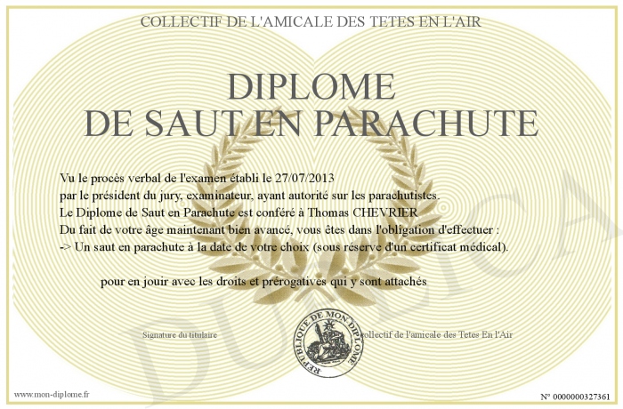 Envoyez par email votre Diplôme de Saut en Parachute personalisé
