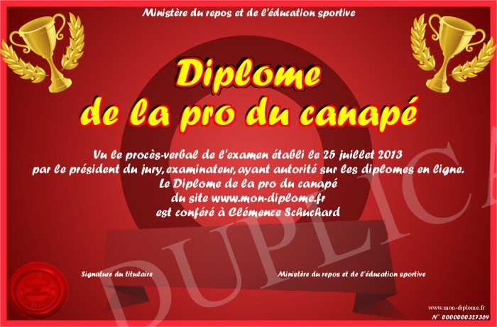 Envoyez par email votre Diplôme de la pro du canapé personalisé