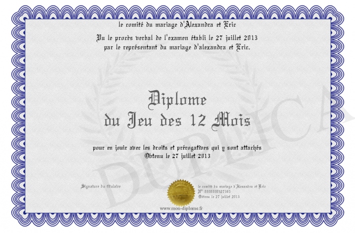 Envoyez par email votre Diplôme du Jeu des 12 Mois personalisé