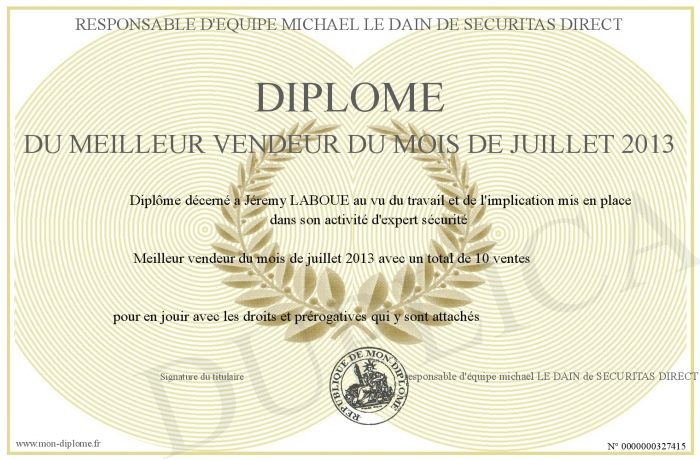 Envoyez par email votre Diplôme du meilleur vendeur du mois de juillet 2013 personalisé