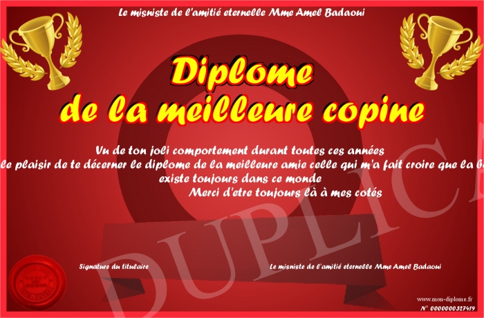 Envoyez par email votre Diplôme de la meilleure copine personalisé