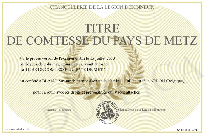 Envoyez par email votre TITRE DE COMTESSE DU PAYS DE METZ personalisé