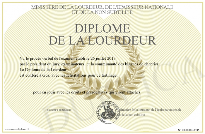 Envoyez par email votre Diplôme de la Lourdeur personalisé
