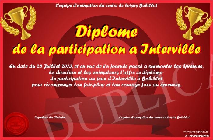 Envoyez par email votre Diplôme de la participation a Interville personalisé