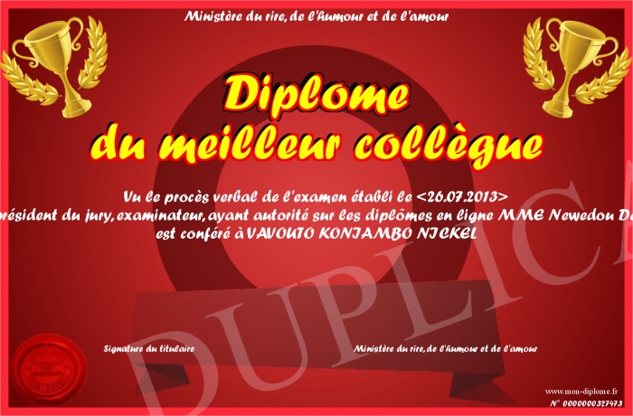 Envoyez par email votre Diplome du meilleur collègue personalisé