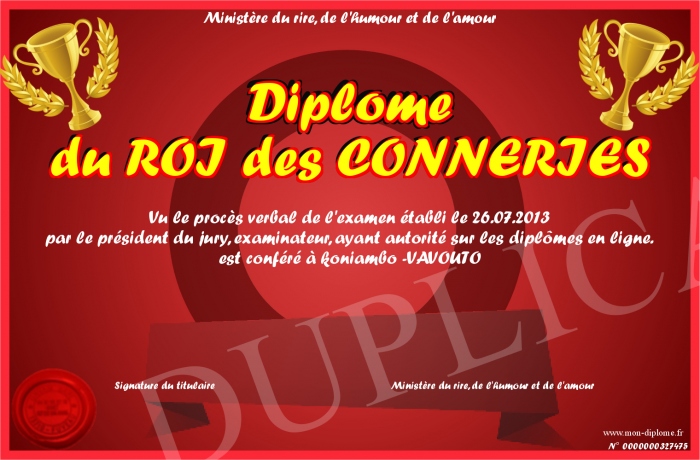 Envoyez par email votre Diplome du ROI des CONNERIES personalisé