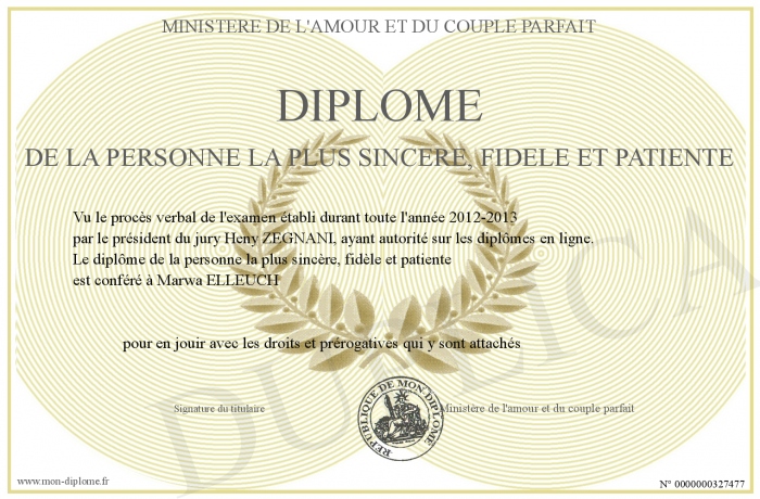 Envoyez par email votre Diplome de la personne la plus sincère, fidèle et patiente personalisé