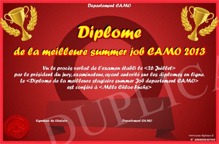 Envoyez par email votre Diplôme de la meilleure summer job CAMO 2013 personalisé