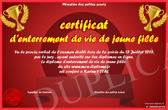 Envoyez par email votre certificat d'enterrement de vie de jeune fille personalisé