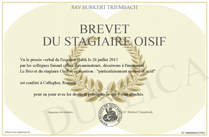 Envoyez par email votre Brevet du stagiaire Oisif personalisé