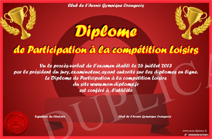 Envoyez par email votre Diplôme de Participation à la compétition Loisirs personalisé