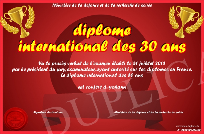 Envoyez par email votre diplome international des 30 ans personalisé
