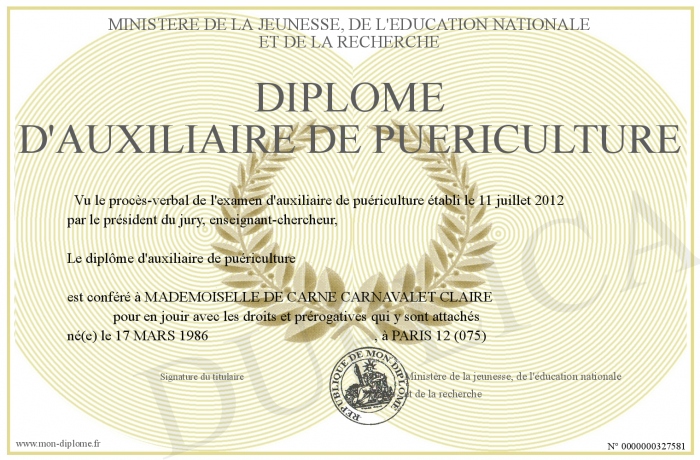Envoyez par email votre Diplôme d'auxiliaire de puériculture personalisé