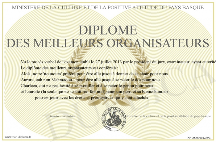 Envoyez par email votre Diplôme des meilleurs organisateurs personalisé