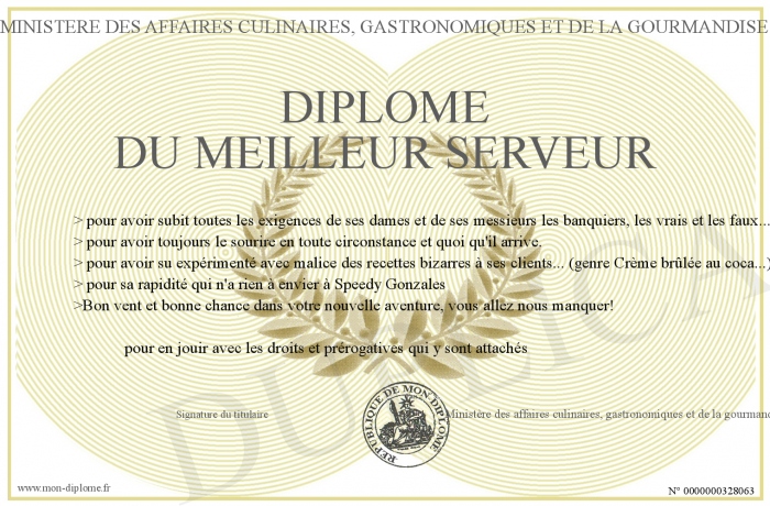 Envoyez par email votre Diplôme du meilleur serveur personalisé