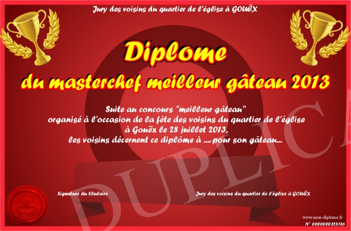 Envoyez par email votre Diplôme du masterchef meilleur gâteau 2013 personalisé