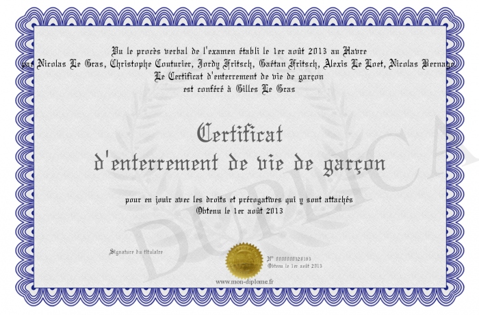 Envoyez par email votre Certificat d'enterrement de vie de garçon personalisé