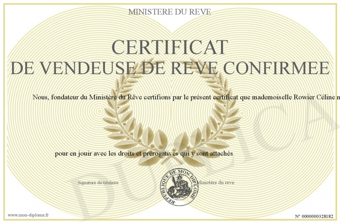 Envoyez par email votre Certificat de vendeuse de reve confirmée personalisé