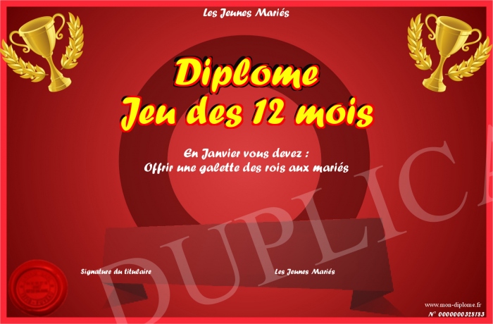 Envoyez par email votre Diplôme Jeu des 12 mois personalisé