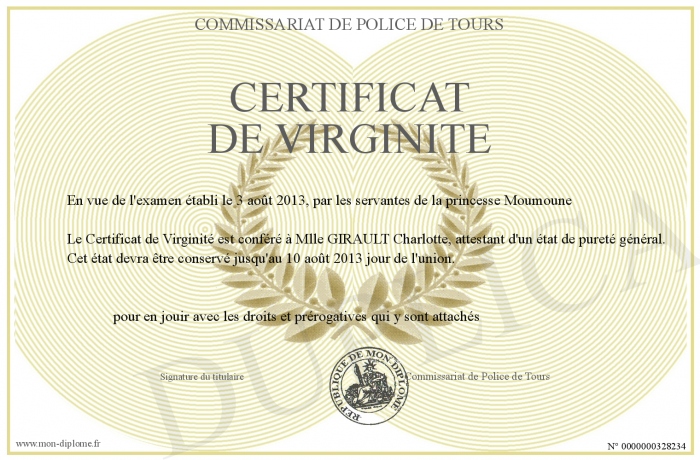 Envoyez par email votre Certificat de Virginité personalisé