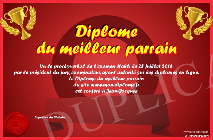 Envoyez par email votre Diplôme du meilleur parrain personalisé