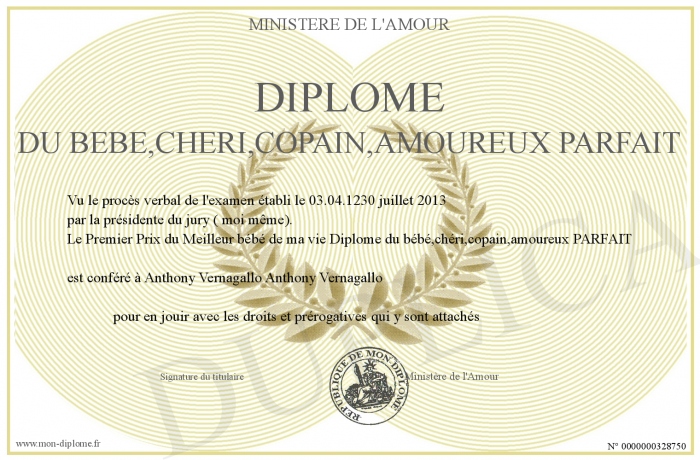 Envoyez par email votre Diplôme du bébé,chéri,copain,amoureux PARFAIT personalisé