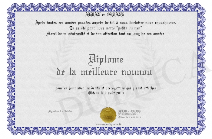 Envoyez par email votre Diplôme de la meilleure nounou personalisé