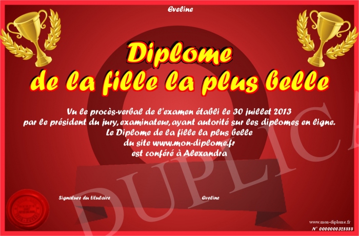 Envoyez par email votre Diplôme de la fille la plus belle personalisé