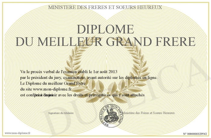 Envoyez par email votre Diplôme du meilleur Grand Frère personalisé
