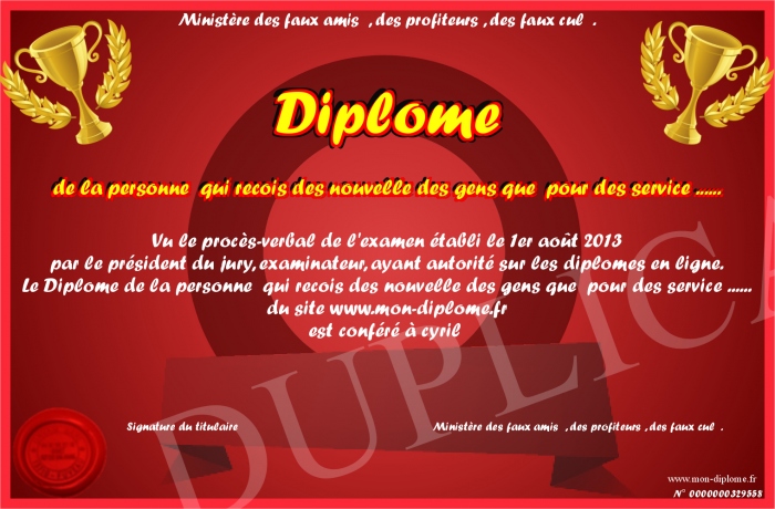 Envoyez par email votre Diplôme de la personne qui recois des nouvelle des gens que pour des service ...... personalisé
