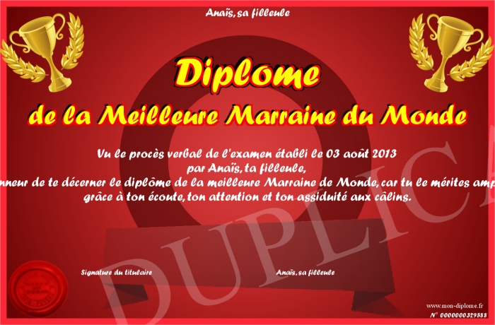 Envoyez par email votre Diplôme de la Meilleure Marraine du Monde personalisé