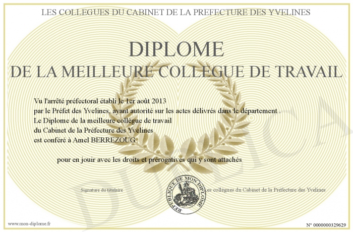 Envoyez par email votre Diplôme de la meilleure collègue de travail personalisé