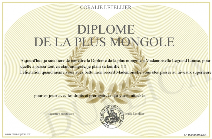Envoyez par email votre Diplôme de la plus mongole personalisé