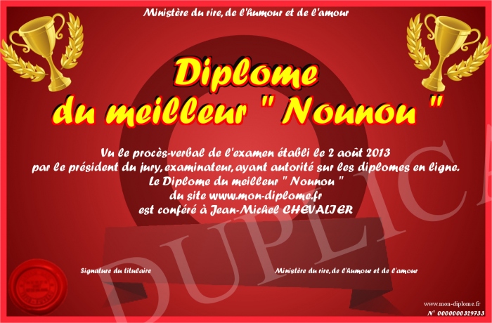 Envoyez par email votre Diplome du meilleur - Nounou - personalisé