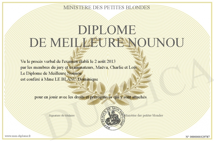 Envoyez par email votre Diplôme de Meilleure Nounou personalisé