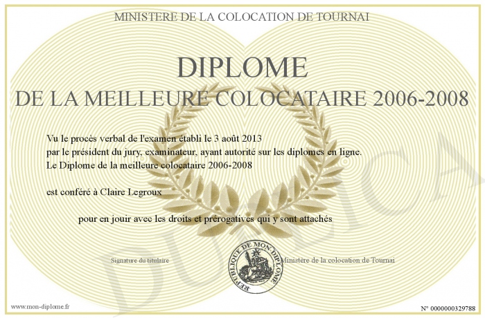 Envoyez par email votre Diplôme de la meilleure colocataire 2006-2008 personalisé