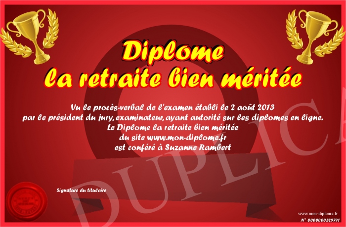 Envoyez par email votre Diplôme la retraite bien méritée personalisé