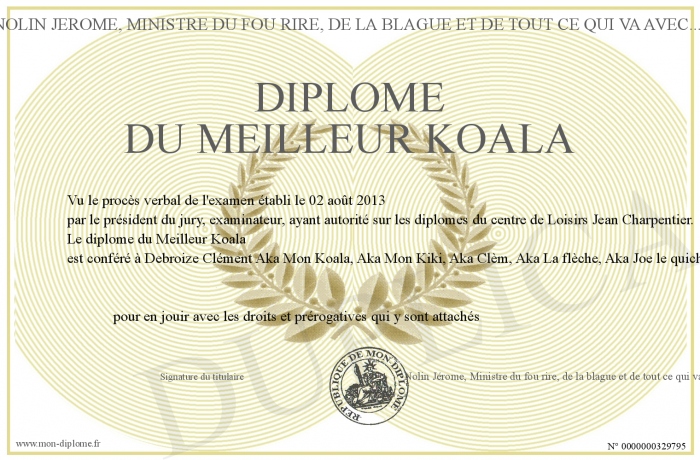 Envoyez par email votre Diplôme du meilleur Koala personalisé