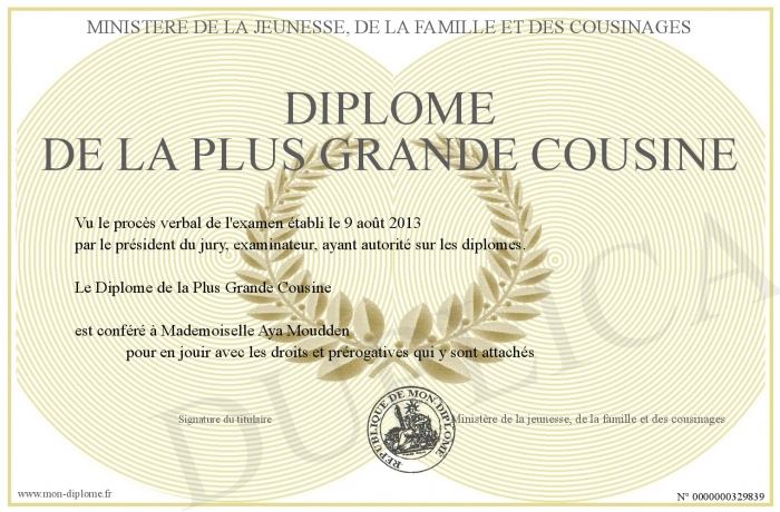Envoyez par email votre Diplôme de la Plus Grande Cousine personalisé