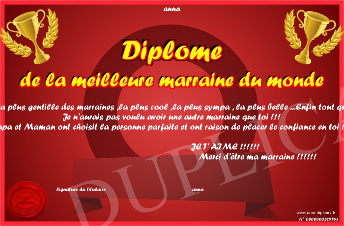 Envoyez par email votre Diplôme de la meilleure marraine du monde personalisé